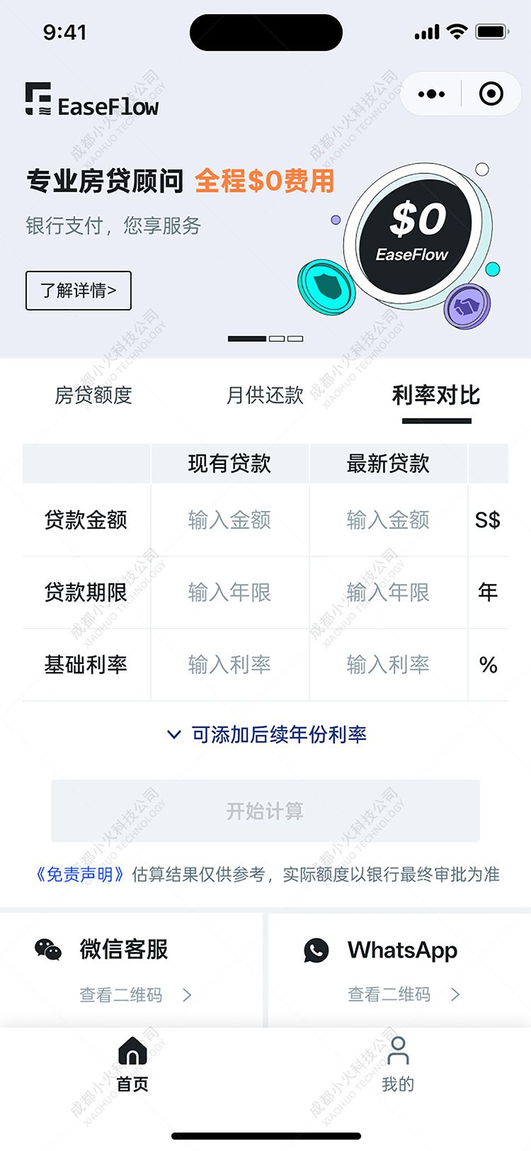 這是成都小火科技公司給新加坡Easeflow Consultancy房產(chǎn)企業(yè)開發(fā)的海外版微信(wechat)小程序。這套小程序是以房貸為核心,包含房貸計(jì)算,房貸額度申請(qǐng),房貸月供演示,房貸詳情查看等功能。