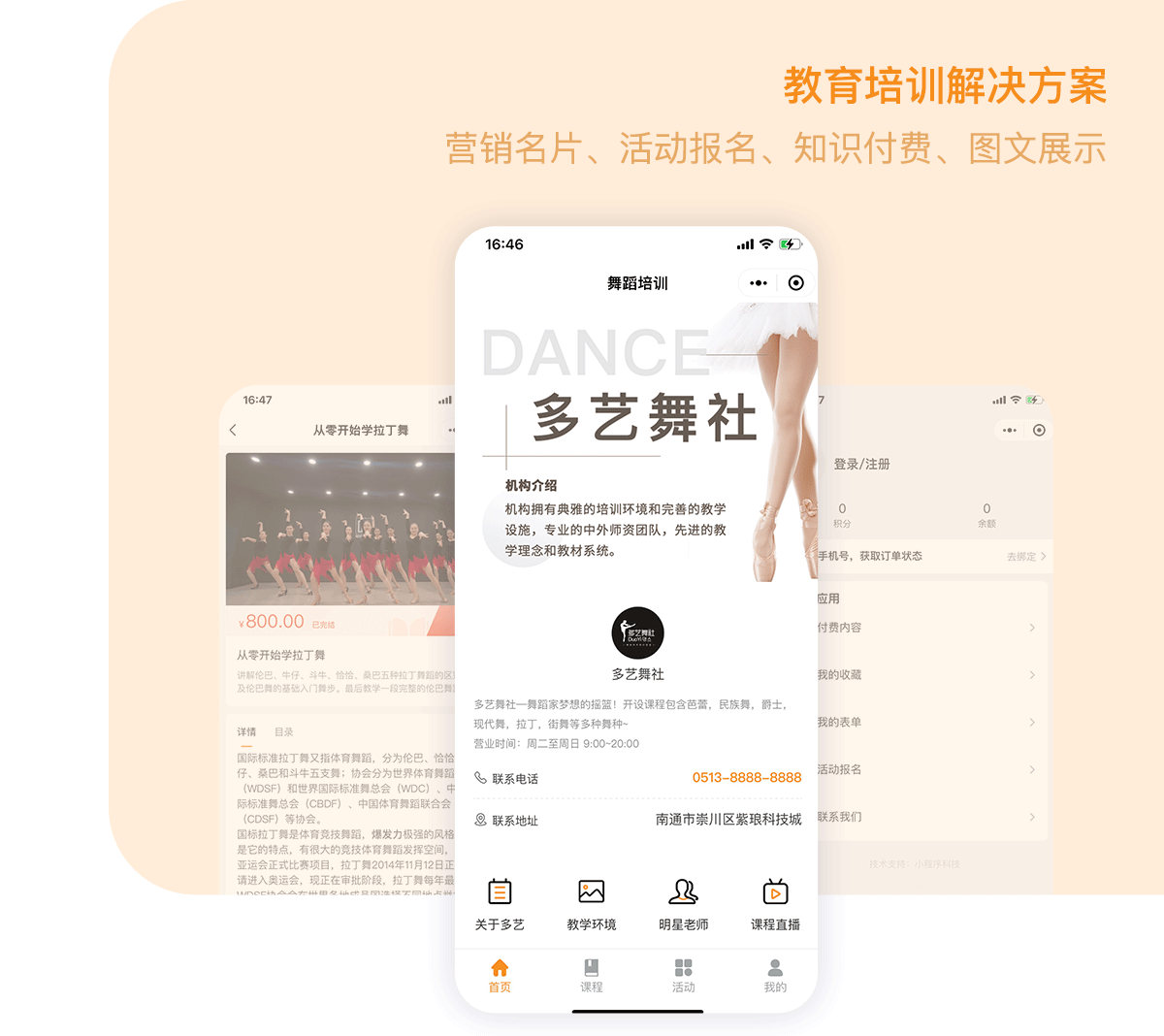 那么,這款舞蹈培訓專用APP為機構方帶來了哪些價值呢?首先,通過展示舞蹈機構的資料、老師簡歷、學員風采和結業證書等信息,可以提高機構的知名度和影響力,吸引更多的學員報名。其次,網上報名和體驗課預約功能的實現,可以讓機構更加便捷地管理學員報名和試聽事務,提高工作效率。最后,在線查看課程表、課程進度以及現場照片和視頻的功能,可以幫助機構更好地了解學員的學習情況,及時調整教學方法和課程內容,提高教學質量。