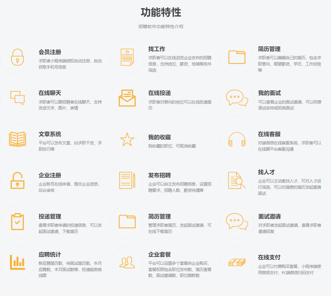 成都小火科技作為一家軟件開發公司,從2013年成立至今,先后參與了數以百計的政企項目,我們對我們接手的每一個項目都高度重視,不管是大體量的項目,還是小程序、APP應用,我們都高度重視。今天給大家介紹一款招聘軟件小程序,該招聘軟件旨在為企業和個人提供便捷、高效的招聘服務。該小程序包含微信小程序求職者端、微信小程序企業招聘端、PC企業招聘端、PC管理平臺端,涵蓋了從求職者到企業的全方位招聘需求。下面是這款招聘小程序的主要功能,有相關需求的用戶,請與我司交流。