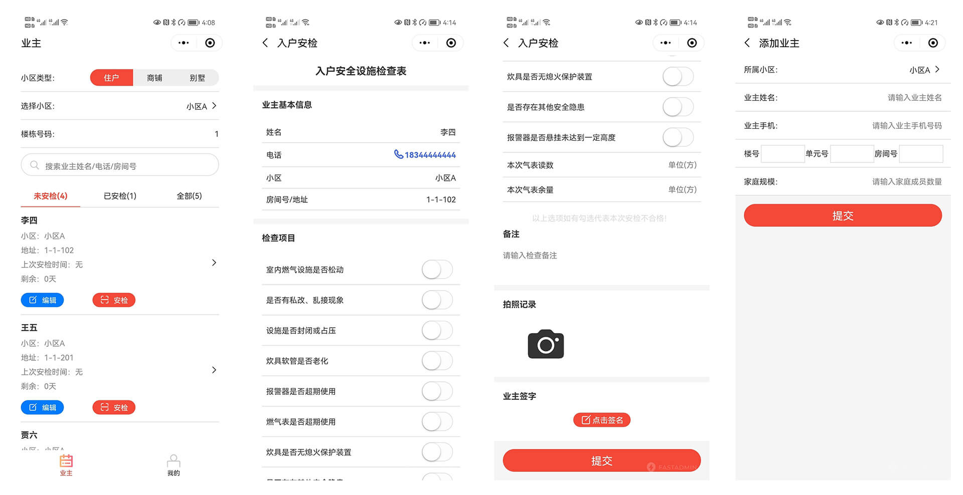 在業主管理方面,管理人員可以通過后臺方便地添加或批量導入業主信息,并能直觀地看到每個業主家中設備的安檢狀態和安檢記錄。這不僅便于及時跟進安檢工作,也使得業主能夠清晰地了解自己的安檢情況。